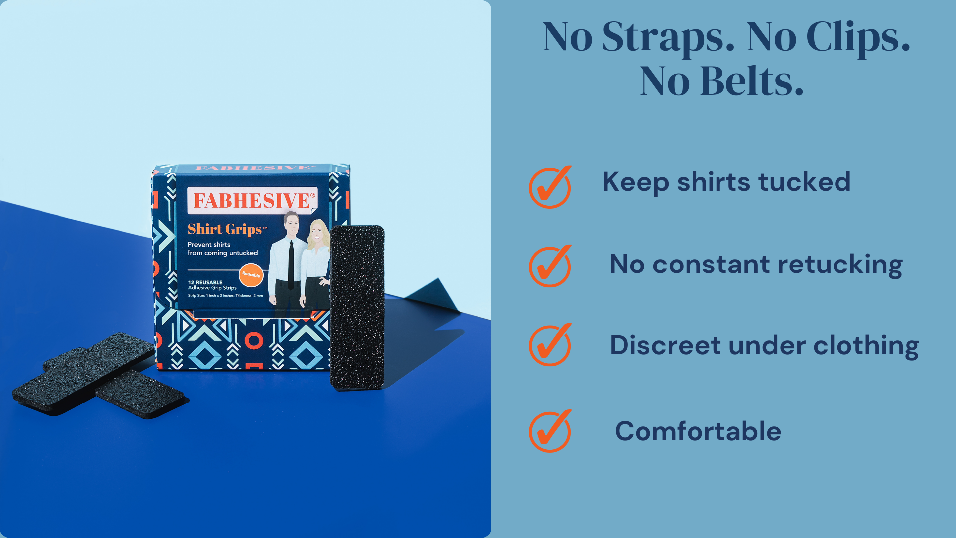 Shirt Grips adhere to the inside of pants or skirt waistbands. The outward-facing grip creates friction against the shirt fabric, helping it stay in place while you move throughout the day.